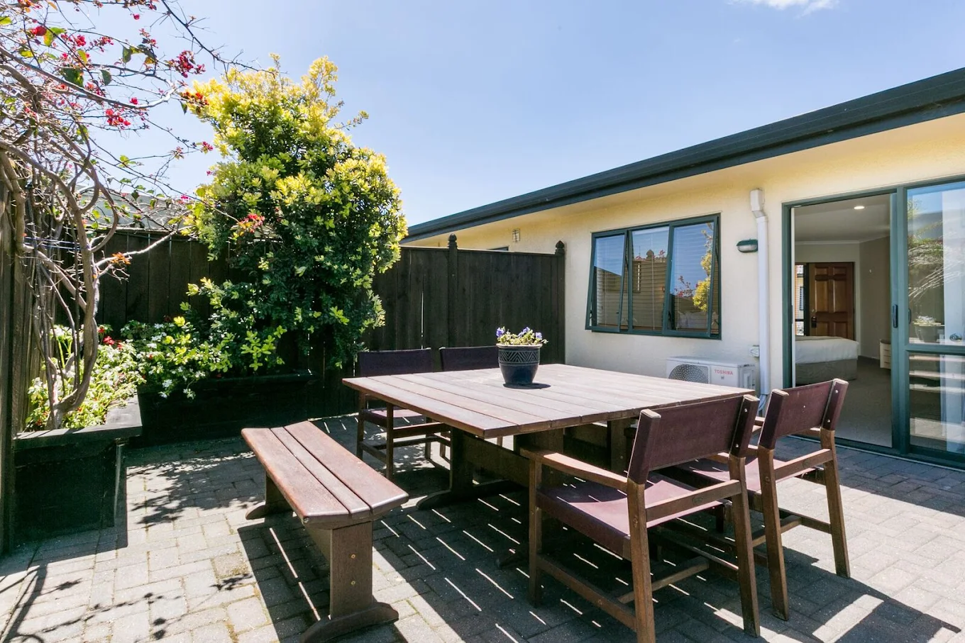 Step out to your large private courtyard with outdoor furniture, perfect for enjoying the Hawke’s Bay sunshine and a glass of local red wine. The bathroom includes a separate shower and a double spa bath, while the living area has a 43" Smart TV with SKY TV for your entertainment.