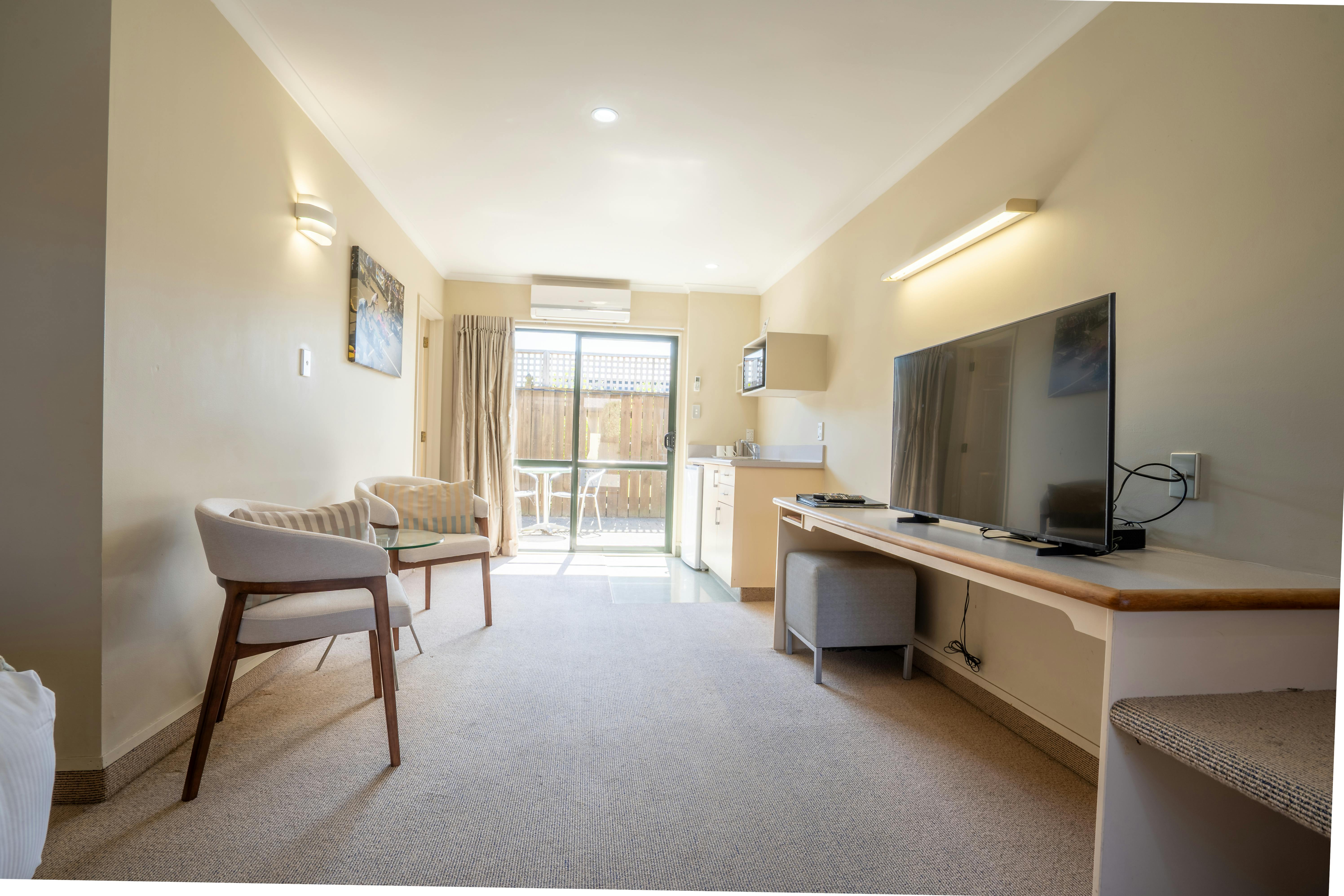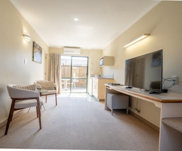 Step into your private beachside retreat with your own parking and entrance. This air-conditioned apartment features a separate bedroom with a queen-sized double bed, dressed in triple-layered quality linens for a restful night’s sleep. The bedroom also includes a wall-mounted TV for your entertainment.