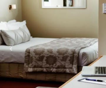 Inside, unwind on a super king double bed, triple sheeted with quality linens for a luxurious night’s sleep. The spacious living area features a 43" Smart TV and a contemporary table with chairs.
